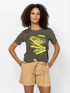 Koszulka damska z krótkim rękawem, o regularnym kroju, z okrągłym dekoltem i zdobieniem z przodu. Materiał: 50% bawełna, 50% modal, dzianina single jersey. Modelka ma 175 cm wzrost