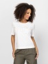 Damska koszulka z krótkim rękawem, wykonana z wysokiej jakości bawełny, z okrągłym dekoltem i rękawami sięgającymi do łokci. Haftowana i ozdobiona perełkami z przodu. Materiał: 100% bawełna. Modelka ma 175 cm wzrostu i nosi rozmiar S.