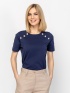 Kobieta koszulka z krótkim rękawem o regularnym kroju, okrągłym dekoltem i ozdobnymi guzikami na ramionach. Wykonana z wysokiej jakości bawełny, z małym metalowym logo marki z tyłu