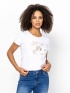 Kobieta koszulka z krótkim rękawem o dopasowanym kroju, okrągłym dekolcie i zdobieniem z przodu. Materiał: 100% bawełna single jersey. Modelka ma 175 cm wzrostu i nosi rozmiar S.