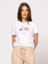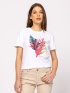 Damska koszulka z krótkim rękawem o prostym kroju, z okrągłym dekoltem, rękawami z klapami, letnią ozdobą z przodu, wykonana z czystej bawełny. Wykonany ze 100 bawełny, slub jersey. Modelka ma 175 cm wzrostu i nosi rozmiar S.