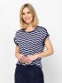 Kobieta koszulka z krótkim rękawem o luźnym kroju, okrągłym dekolcie i opuszczonymi ramionami. Wykonana z materiału w paski z ozdobnymi guzikami na ramionach. Materiał: 50% bawełna