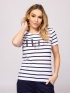 Damska koszulka z krótkim rękawem o lekko dopasowanym kroju, okrągły dekolt, klasyczne paski, materiał bawełniany z domieszką elastanu, nadruk i ozdoba z dżetów z przodu. Materiał: