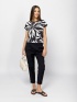 Damska długa spodnie z prostymi nogawkami, wygodnym krojem, podwiniętym brzegiem i zagięciem. Z przednimi kieszeniami, imitacją tylnej kieszeni i elastycznym paskiem. Materiał: 63% poliester, 32% wiskoza, 5% elastan. Modelka ma 175 cm wzrostu i nosi rozmiar S.