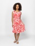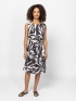 Damska sukienka bez rękawów z płótna, sięgająca powyżej kolan, z plisowaną spódnicą, paskiem w talii, boczną kieszenią, wykonana z materiału wzorzystego. Materiał: 100% wiskoza. Modelka ma 175 cm wzrostu i nosi rozmiar S.