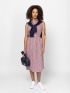 Damska sukienka koszulowa bez rękawów, sięgająca poniżej kolan, z rozkloszowaną spódnicą. Ukryte zapięcie na guziki, pasek w talii, kieszeń boczna, wykonana z tkaniny w paski. Mate