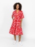 Sukienka damska o rozkloszowanym, marszczonym kroju, długości poniżej kolan, z kołnierzem w kształcie litery V i rękawami do łokci. Wykonana z jednolitego i wzorzystego materiału,