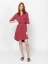 Sukienka damska z płótna, sięgająca powyżej kolan, z marszczonym stójką, dekoltem w szpic, regulowaną talią za pomocą paska, rękawami do łokci i małym logo marki z tyłu. Materiał: