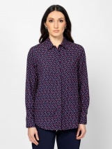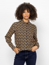 Damska bluzka koszulowa z rozkloszowanym krojem, ozdobnym kołnierzykiem, ukrytym zapięciem na guziki, mankietami na guziki, łatwym w pielęgnacji materiałem wiskozowym, eleganckimi wzorami, małym metalicznym brandingiem z tyłu. Materiał: 100% wiskoza. Modelka ma 175 cm wzrostu i ma na sobie rozmiar S.