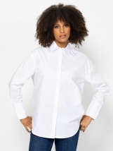 Damska koszula o prostym, rozkloszowanym kroju, w klasycznych kolorach, z zaokrąglonym dołem, z małym metalicznym brandingiem z tyłu, z czystej bawełny. Materiał: 100% bawełna, popelina. Modelka ma 175 cm wzrostu i nosi rozmiar S.
