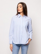 Damska bluzka koszulowa, prosty krój z szerszym wycięciem, ukryte zapięcie na guziki, modny wzór, mały metaliczny branding z tyłu, wykonana z czystej tkaniny bawełnianej. Materiał: 100% bawełna, popelina. Modelka ma 175 cm wzrostu i nosi rozmiar S.