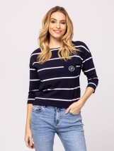 Damska koszulka z długim rękawem, prosty krój, dekolt w łódkę, paski w stylu żaglówki, materiał bawełniany z domieszką elastanu, logo marki z boku, przednia kieszeń z logo marki. M