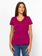 Damska koszulka z krótkim rękawem, slim fit, dekolt w szpic, materiał bawełniany z domieszką modalu, z przodu mały nadrukowany branding z kamieniami, z boku tkana metka. Materiał:
