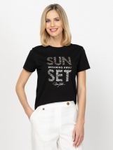 Damska koszulka z krótkim rękawem, regularny krój, okrągły dekolt, z nadrukiem z przodu. Materiał: 100% bawełna, dżersej slub. Modelka ma 175 cm wzrostu i nosi rozmiar S.