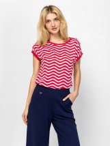 Kobieta koszulka z krótkim rękawem o luźnym kroju, okrągłym dekolcie i opuszczonymi ramionami. Wykonana z materiału w paski z ozdobnymi guzikami na ramionach. Materiał: 50% bawełna