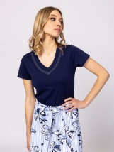Damska koszulka z krótkim rękawem o lekko dopasowanym kroju, wykonana z wygodnej mieszanki bawełny, z dekoltem w szpic z kamieniami i małym metalicznym brandingiem na dole, w klasy