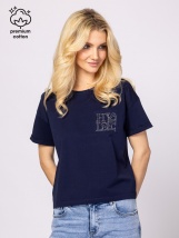 Damska koszulka z krótkim rękawem o szerszym kroju, z okrągłym dekoltem, rękawami z klapami i dżetami na przedniej kieszeni. Wykonany z wysokiej jakości przędzy bawełnianej zapewni