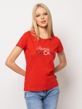 Damska koszulka z krótkim rękawem o lekko dopasowanym kroju, z okrągłym dekoltem i nadrukiem z przodu. Materiał: 100% bawełna, single jersey. Modelka ma 175 cm wzrostu i nosi rozmiar S.