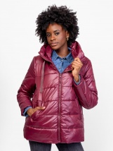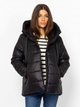 Damska pikowana kurtka o szerszym kroju, długości do bioder, z wewnętrzną klapą przeciwwiatrową, stałym kapturem, prostymi kieszeniami, małym metalowym brandingiem na rękawie i kap