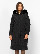Damski pikowany płaszcz zimowy o kobiecej sylwetce, długości do kolan, zewnętrznej klapie przeciwwiatrowej, odpinanym kapturze z wykończeniem ze sztucznego futra, przednich ukrytyc