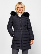 Damski pikowany płaszcz zimowy o kobiecej sylwetce, długość powyżej kolan, odpinany kaptur, odpinane futrzane wykończenie kaptura, dopasowane ukryte kieszenie zapinane na suwak, pr