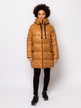 Damski pikowany płaszcz o szerszym kroju, długości powyżej kolan, z wewnętrzną klapą przeciwwiatrową, stałym kapturem, kieszeniami zapinanymi na zamek, materiałem o umiarkowanej wo