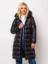 Damski pikowany płaszcz zimowy o przedłużonym kroju, do kolan, z wewnętrznym wiatrołapem, stałym regulowanym kapturem, zapinanymi na zamek kieszeniami z obszyciem, prążkowanym wyko