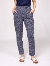 Damskie spodnie o wygodnym kroju, z ekscytującymi wzorami, elastyczną talią, kieszeniami z przodu, sztucznymi kieszeniami z tyłu, małym metalowym brandingiem. Dobrze wentylowana tkanina wiskozowa dla wyjątkowego komfortu. Materiał: 100% wiskoza. Modelka ma 175 cm wzrostu i nosi rozmiar S.