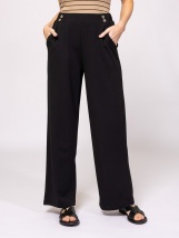 Damskie spodnie w podstawowych kolorach, z wygodną rozszerzaną nogawką, elastyczną talią, kieszeniami z przodu, małymi metalowymi guzikami z logo. Lekki, dobrze wentylowany materia