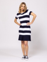 Damska letnia sukienka z krótkimi rękawami, okrągłym dekoltem, długością do kolan, marszczoną spódnicą, inspirowanymi żeglarstwem kolorami i wzorem, elastyczną bawełnianą tkaniną. Materiał: 95% bawełna, 5% elastan, single jersey. Modelka ma 175 cm wzrostu i nosi rozmiar S.