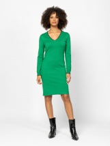 Damska sukienka z cienkiej dzianiny o kobiecej sylwetce, długość powyżej kolan, dekolt w szpic, prążkowany ściągacz przy szyi i mankietach, mały metaliczny branding na dole z przod