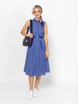 Damska sukienka koszulowa bez rękawów, sięgająca poniżej kolan, z rozkloszowaną spódnicą. Ukryte zapięcie na guziki, pasek w talii, kieszeń boczna, wykonana z tkaniny w paski. Mate