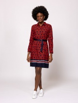 Damska sukienka koszulowa o prostym kroju, długość powyżej kolan, ozdobny kołnierzyk, zapięcie na guziki, talia z paskiem, ciekawe wzory, łatwy w pielęgnacji materiał, mały metalow