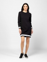 Damska sukienka z okrągłym dekoltem, prosty krój, długość powyżej kolan, prążkowany dół i mankiety, lureksowe logo na dole i mankietach, małe metalowe logo na rękawie. Materiał: 73