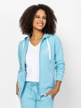 Damska bluza z kapturem, zamkiem błyskawicznym, prążkowanym dołem i mankietami oraz logo marki z przodu. Połącz ją z naszymi spodniami ZARIVAS26 lub ZOBERTA. Materiał: 58% bawełna,