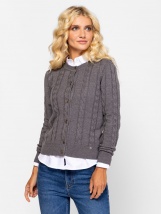 Damski kardigan z dzianiny z klasycznym zapięciem na guziki, skręconym wzorem, okrągłym dekoltem, małym metalowym brandingiem na dole z przodu. Materiał: 55% akryl, 45% bawełna, dz
