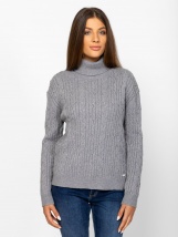 Damski sweter z dzianiny z golfem o szerszym kroju, z obniżonym ramieniem, skręconym wzorem z przodu i na rękawach, małym plastikowym brandingiem na dole z przodu. Materiał: 49% wi