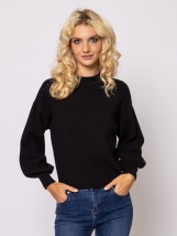 Damski sweter z dzianiny z wysokim dekoltem, szerszym krojem, rękawami typu buggy, podstawowymi kolorami, małym metalicznym brandingiem u dołu z przodu. Materiał: 50% wiskoza, 27%