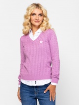 Damski sweter z dzianiny o klasycznym kroju, z dekoltem w szpic, skręconym dzianinowym wzorem, małym tkanym brandingiem z przodu. Materiał: 55% akryl, 45% bawełna, dzianina. Modelk