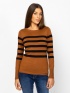 Damski sweter z delikatnej dzianiny z ciekawymi paskami, okrągłym dekoltem i małym metalowym logo marki na dole z przodu. Materiał: 75% wiskoza, 25% nylon, dzianina. Modelka ma 175 cm wzrostu i nosi rozmiar S.Mniej informacji