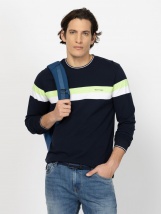 Męska koszulka z długim rękawem, okrągłym dekoltem, regularnym krojem, paskami w górnej części i małym logo marki z przodu. Materiał: 100% bawełna, piqué. Model ma 188 cm wzrostu i