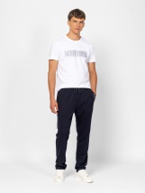 Męskie spodnie dresowe z wygodnym krojem, zwężaną nogawką, regulowaną sznurkiem, elastyczną talią, kieszeniami, tylną sztuczną kieszenią, wentylowanym materiałem, małym logo marki na przedniej kieszeni. Materiał: 80% bawełna, 20% poliester, wewnątrz szczotkowany polar. Modelka ma 188 cm wzrostu i nosi rozmiar M.